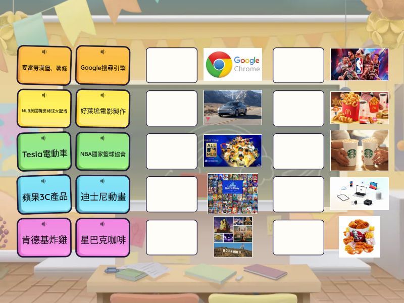 蘋果3C產品, Google搜尋引擎, Tesla電動車, 麥當勞漢堡、薯條, 肯德基炸雞, 星巴克咖啡, NBA國家籃球協會, MLB美國職業棒球大聯盟, 迪士尼動畫, 好萊塢電影製作,