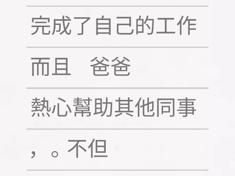 爸爸 不但 完成了自己的工作 , 而且 熱心幫助其他同事 。, 我 不但 完成了老師安排的作業 , 而且 預習了新的課文 。, 他 不但 會寫書法 , 而且 得到書法比賽的冠軍 。, 老師 不但 教會了我們課本上的知識 , 而且 幫我們建立正確的價值觀 。, 閱讀 不但 可以消磨時間 , 而且 可以增長知識 。, 我 不但 考了全班第一名 , 而且 考了全校第一名 。,