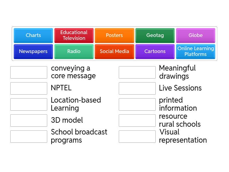 Geotag - Location-based Learning, Charts - Visual representation, Globe - 3D model, Cartoons - Meaningful drawings, Posters - conveying a core message, Newspapers - printed information, Educational Television - School broadcast programs, Radio - resource rural schools, Social Media - Live Sessions, Online Learning Platforms - NPTEL,