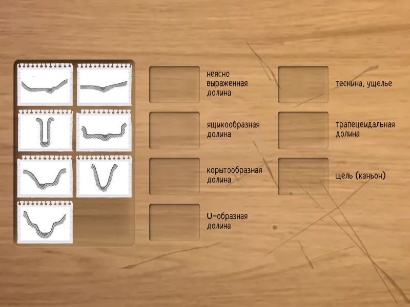 щель (каньон), теснина, ущелье, U-образная долина, корытообразная долина, трапецеидальная долина, ящикообразная долина, неясно выраженная долина,