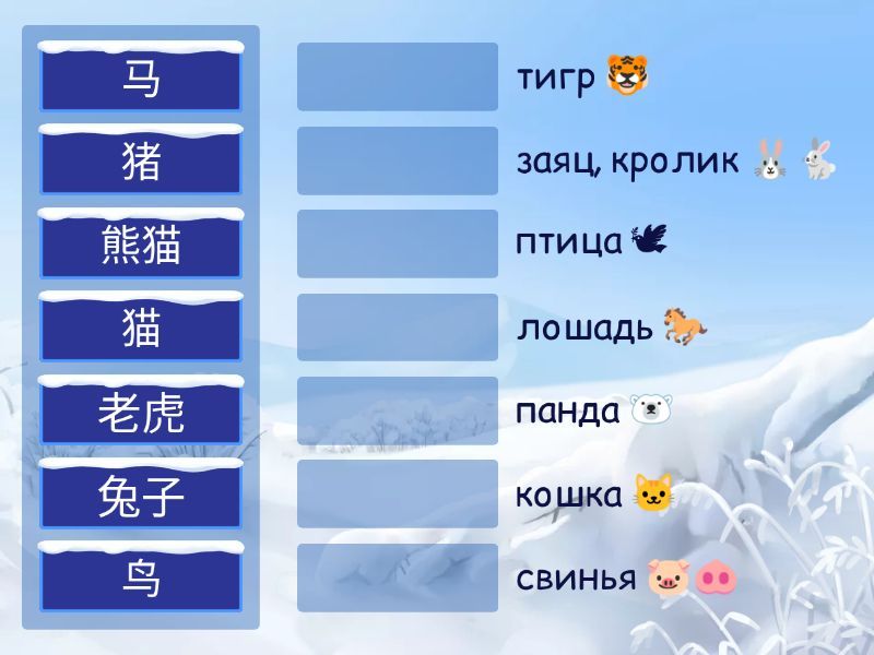 猫 - кошка 🐱, 狗 - собака 🐶, 鱼 - рыба 🐠, 兔子 - заяц, кролик 🐰🐇, 乌龟 - черепаха 🐢, 牛 - корова 🐮, 羊 - баран, овца 🐏🐑, 马 - лошадь 🐎, 猪 - свинья 🐷🐽, 鸟 - птица 🕊, 老虎 - тигр 🐯, 熊猫 - панда 🐻❄, 老鼠 - крыса 🐁🐀,
