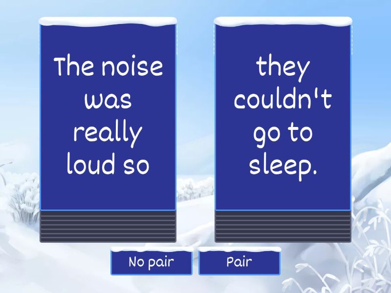 The noise was really loud so - they couldn't go to sleep., He was tired so - he went to bed early., They were afraid so - they didn't watch the horror film., He finished his homework so - he went out to play., They were late so - they caught the bus home., It was his birthday so - he had a party., They were hungry so - they ate lots of food., They were thirsty so - they drank water.,