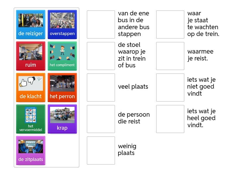 de klacht - iets wat je niet goed vindt, het compliment - iets wat je heel goed vindt., het perron - waar je staat te wachten op de trein., het vervoermiddel - waarmee je reist., de zitplaats - de stoel waarop je zit in trein of bus, de reiziger - de persoon die reist, krap - weinig plaats, ruim - veel plaats, overstappen - van de ene bus in de andere bus stappen,