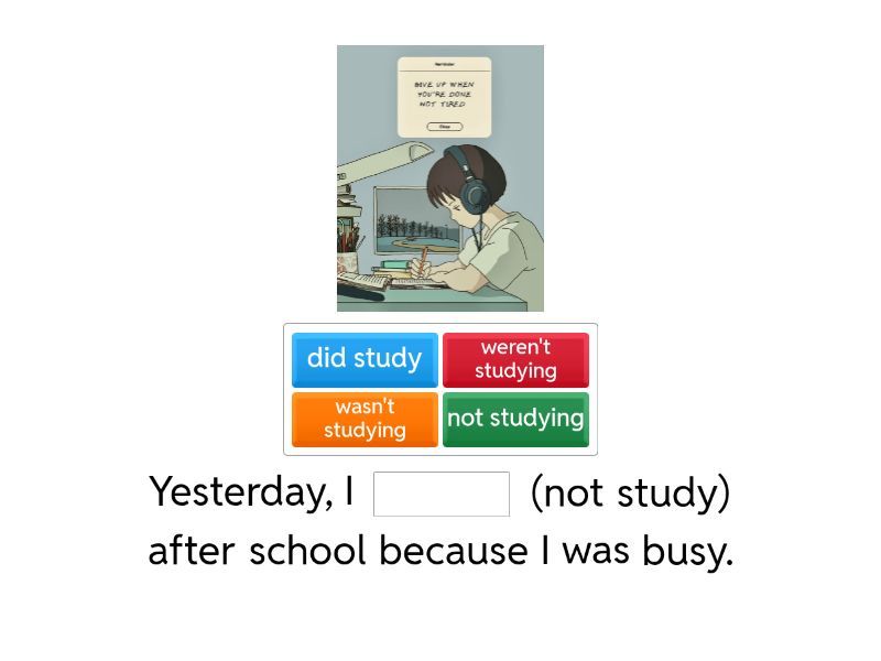 Yesterday, I ____ (not study) after school because I was busy. When my father came back from work yesterday, I ____ (play) with my dog. When I got home last night, my sister ____ (watch) a movie. Yesterday, we ____ to school when I saw my friend. This morning I ____ (eat) breakfast at 7:30 am with my family. Last Saturday afternoon, they ____ at the mall. When I got to the park, my friends ____ (play) hide and seek. Last night, you ____ (read) your new book when you fell asleep. What music ____ you ____ to when I entered your room? It ____ cats and dogs when my father had an accident last weekend.
