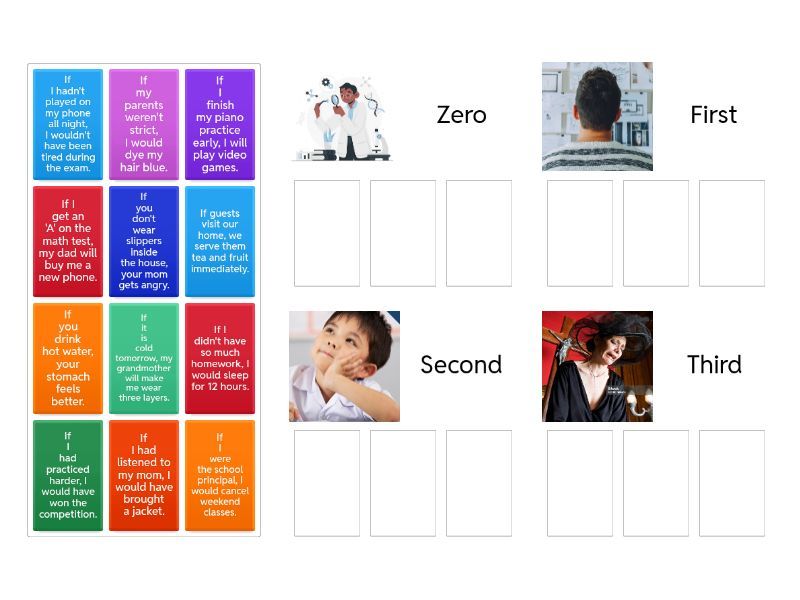 Zero: If you drink hot water, your stomach feels better., If you don't wear slippers inside the house, your mom gets angry., If guests visit our home, we serve them tea and fruit immediately., First: If I get an 'A' on the math test, my dad will buy me a new phone., If I finish my piano practice early, I will play video games., If it is cold tomorrow, my grandmother will make me wear three layers., Second: If I were the school principal, I would cancel weekend classes., If I didn't have so much homework, I would sleep for 12 hours., If my parents weren't strict, I would dye my hair blue., Third: If I had listened to my mom, I would have brought a jacket., If I hadn't played on my phone all night, I wouldn't have been tired during the exam., If I had practiced harder, I would have won the competition.,