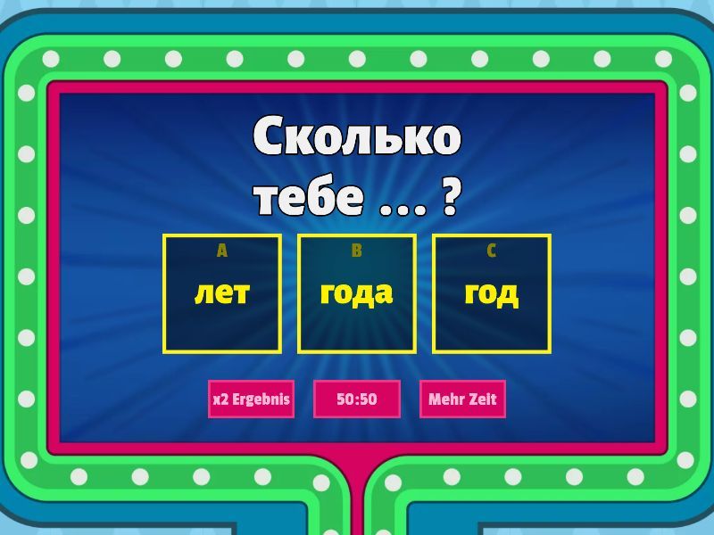 1) Сколько тебе ... ? a) лет b) года c) год 2) Мне 12 ... . a) лет b) года c) год 3) Маме 34 ... . a) лет b) года c) год 4) Папе 39 ... . a) лет b) года c) год 5) Бабушке 61 ... . a) лет b) года c) год 6) Дедушке 64 ... . a) лет b) года c) год 7) Сестре Кате 8 ... . a) лет b) года c) год 8) Брату Антону 3 ... . a) лет b) года c) год 9) Собаке Чарли 1 ... . a) лет b) года c) год