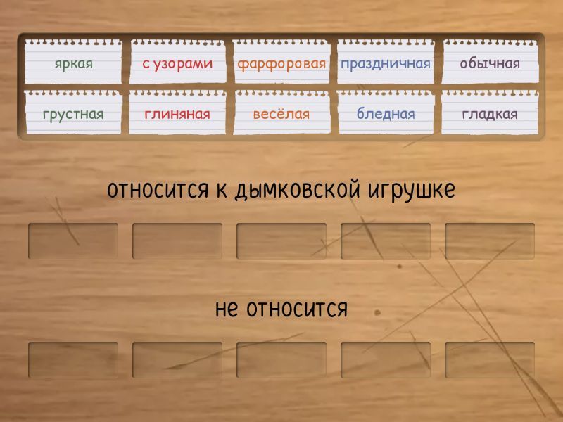 относится к дымковской игрушке: весёлая, глиняная, яркая, с узорами, праздничная, не относится: фарфоровая, бледная, грустная, гладкая, обычная,