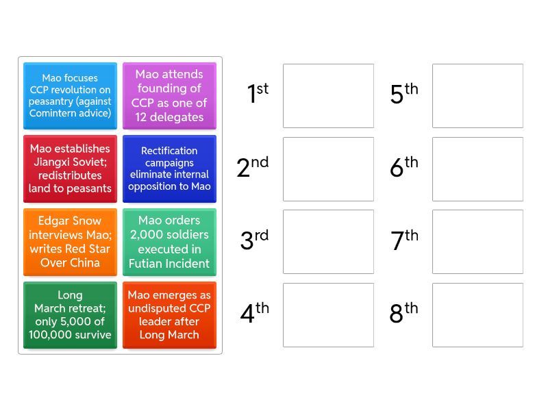 Mao attends founding of CCP as one of 12 delegates, Mao focuses CCP revolution on peasantry (against Comintern advice), Mao orders 2,000 soldiers executed in Futian Incident, Mao establishes Jiangxi Soviet; redistributes land to peasants, Long March retreat; only 5,000 of 100,000 survive, Mao emerges as undisputed CCP leader after Long March, Edgar Snow interviews Mao; writes Red Star Over China, Rectification campaigns eliminate internal opposition to Mao.