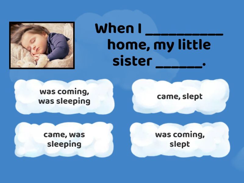 1) When I __________ home, my little sister ______. a) was coming, was sleeping b) came, slept c) came, was sleeping d) was coming, slept 2) When mother___________ home, I _______ my homework a) was coming, did b) came, was doing c) came, did d) was coming, was doing 3) When I _____, my parents _______ tea. a) got up, were drinking b) was getting up, were drinking c) got up, drank d) was getting up, drank 4) When I ______ my friends, they _________ football. a) was seeing, played b) saw, played c) saw, were playing d) was seeing, were playing 5) The boy____himself while he ________. a) hurt, skated b) hurt, was skating c) was hurting, skated d) was hurting, was skating 6) When it __________ raining, we _________ in the river. a) started, were swimming b) started, swam c) was starting, were swimming d) was starting, swam 7) When the children _________ in the forest, they_________ a fox. a) walked, were seeing b) were walking, saw c) were walking, were seeing d) walked, saw 8) When Mike _______ in the yard he _________ a ball. a) was playing, found b) played, found c) was playing, was finding d) played, was finding 9) When Nick _____ yesterday, I _______ my mother. a) rang me up, helped b) was ringing me up, was helping c) was ringing me up, helped d) rang me up, was helping 10) When Kate ______ yesterday, she ________ two pencils. a) was drawing, was breaking b) was drawing, broke c) drew, broke d) drew, was breaking