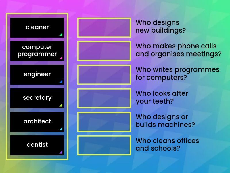 dentist - Who looks after your teeth?, cleaner - Who cleans offices and schools?, engineer - Who designs or builds machines?, computer programmer - Who writes programmes for computers?, architect - Who designs new buildings?, secretary - Who makes phone calls and organises meetings?,