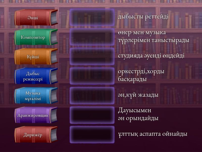 Әнші - Дауысымен ән орындайды, Композитор - ән,күй жазады, Дирижёр - оркестрді,хорды басқарады, Күйші - ұлттық аспапта ойнайды, Дыбыс режиссері - дыбысты реттейді, Аранжировщик - студияда әуенді өңдейді, Музыка мұғалімі - өнер мен музыка түрлерімен таныстырады,