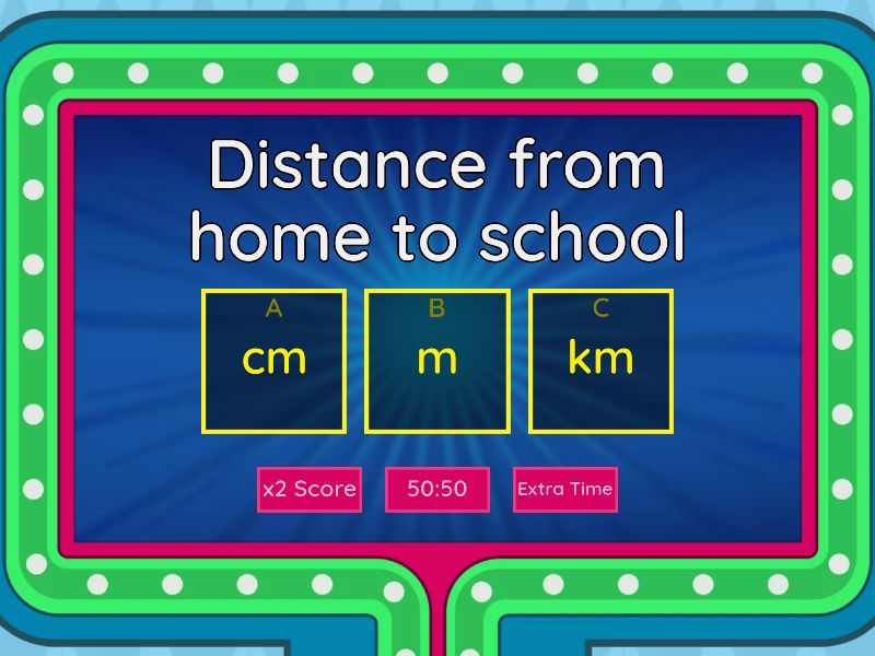1) Length of a crayon a) cm b) m c) km 2) Length of a playground a) cm b) m c) km 3) Journey of a boat from the UK to the USA a) cm b) m c) km 4) Distance from home to school a) cm b) m c) km 5) Distance of a running race a) cm b) m c) km