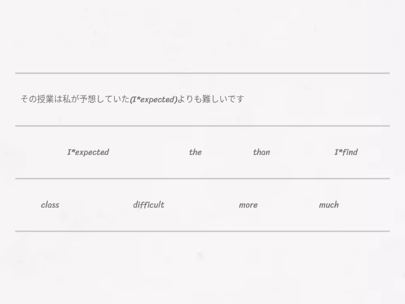 the*Chinese*language has more characters than the*Japanese*language 中国語は日本語より多くの文字(characters)を持っている, I*find the class much more difficult than I*expected その授業は私が予想していた(I*expected)よりも難しいです, can you play the guitar as well as*John ? ジョンと同じくらい上手にギターは弾けますか, Patty doesn’t feel as sad as she did last week パティは先週ほどは悲しくない, The*more I know about Japan , the better I like it 日本について知れば知るほど、ますます好きになる,