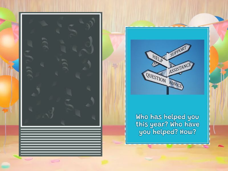Did you travel to any new places this year? Where?, People often eat special foods for important holidays. What holidays do you celebrate with food, and what do you eat?, What were the best things in your life in 2025?, What have you accomplished this year? How did you do it?, Did you start any new habits or routines this year? Why?, In your culture, do people celebrate the new year? How?, What are you looking forward to next year? Why?, Choose a family member or friend that you are proud of. What did they accomplish this year?, What are you hoping to accomplish next year? How will you do it?, How have you improved your English this year? Which methods were effective?, Many Americans give gifts or send cards in December. In your family, when do people give gifts?, Who has helped you this year? Who have you helped? How?, What's a new habit or activity you want to try? When will you start?.