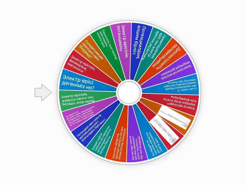 1) Электр өрісі дегеніміз не? a) Зарядталған дененің массасы b) Зарядтардың өзара әсерін жеткізетін орта c) Магниттік құбылыс d) Токтың бағыты 2) Электр өрісінің физикалық мағынасы a) Жылу бөлу b) Жарық шығару c) Зарядқа күшпен әсер ету d) Масса өзгерісі 3) Суперпозиция принципі нені білдіреді? a) Зарядтар жойылады b) Өрістер алгебралық қосылады c) Қорытқы өріс – жеке өрістердің векторлық қосындысы d) Өрістер тәуелсіз 4) Параллель пластиналар арасындағы электр өрісі a) Біртекті b) Біртекті емес c) Нөлге тең d) Өзгермелі 5) Электр өрісінің потенциалы a) Векторлық шама b) Бірлік зарядқа келетін энергия c) Күш d) Уақыт 6) Потенциалдың өлшем бірлігі a) Н b) Кл c) В d) Дж 7) Гравитациялық өріс пен электр өрісінің ұқсастығы a) Екеуі де магниттік b) Екеуі де күш өрісі c) Екеуі де тек тартылыс d) Екеуі де ток тудырады 8) Диэлектриктің поляризациясы a) Зарядтардың қозғалысы b) Оң және теріс зарядтардың ығысуы c) Электрондардың бөлінуі d) Зарядтың артуы 9) Электростатикалық индукция дегеніміз a) Зарядтардың жойылуы b) Зарядтардың қайта бөлінуі c) Токтың пайда болуы d) Магниттену 10) +2 нКл және −2 нКл зарядтардан бірдей қашықтықтағы нүктедегі қорытқы өріс бағыты a) A) Оң зарядқа қарай b) B) Теріс зарядқа қарай c) C) Жоғары d) D) Төмен 11) Электр өрісіндегі зарядқа әсер ететін күш формуласы a) F=kq^2 b) F=mg c) F=qE d) F=UI 12) Екі бірдей оң нүктелік зарядтың дәл ортасындағы электр өрісі a) Максимум болады b) Нөлге тең c) Теріс болады d) Шексіз үлкен 13) Бір нүктеде электр өрісінің кернеулігі нөлге тең болса, бұл нені білдіреді? a) Заряд жоқ b) Потенциал нөл c) Қорытқы өрістер бірін-бірі компенсациялайды d) Өріс жоқ 14) Нүктелік зарядтың өрісінде зарядты екі есе алшақтатсақ, кернеулік a) 2 есе артады b) 4 есе артады c) 2 есе кемиді d) 4 есе кемиді 15) Қарама-қарсы таңбалы екі зарядтың ортасындағы электр өрісінің бағыты a) Теріс зарядтан оң зарядқа b) Оң зарядтан теріс зарядқа c) Жоғары d) Бағыты болмайды 16) Потенциал мен электр өрісінің кернеулігі арасындағы байланыс: a) Бір-біріне тәуелсіз b) Кернеулік – потенциалдың градиенті c) Потенциал – кернеуліктің квадраты d) Кернеулік зарядқа тәуелсіз 17) Үш бірдей оң нүктелік заряд теңқабырғалы үшбұрыштың төбелерінде орналасқан. Үшбұрыштың ортасындағы электр өрісі a) Максимум b) Нөлге тең c) Үш есе артады d) Белгісіз 18) Электр өрісінің жұмысы нөлге тең болады, егер заряд a) Өріс бағытымен қозғалса b) Өріс бағытына қарсы қозғалса c) Эквипотенциал бет бойымен қозғалса d) Үдемелі қозғалса