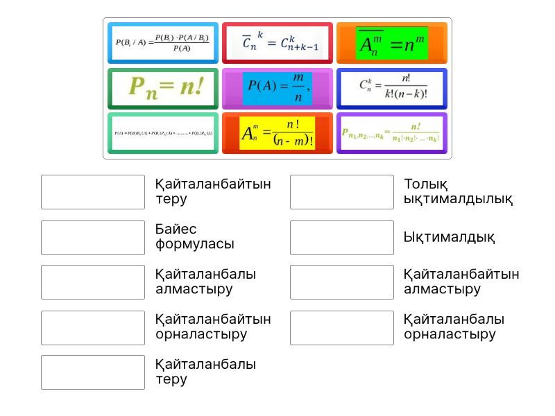Қайталанбайтын орналастыру, Қайталанбалы орналастыру, Қайталанбайтын алмастыру, Қайталанбалы алмастыру, Қайталанбайтын теру, Қайталанбалы теру, Толық ықтималдылық, Байес формуласы, Ықтималдық,
