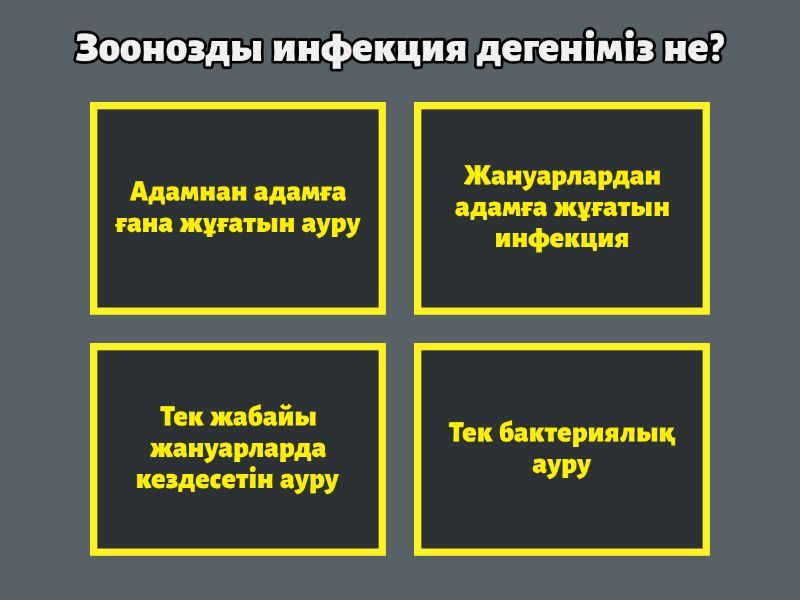 1) Зоонозды инфекция дегеніміз не? a) Адамнан адамға ғана жұғатын ауру b) Жануарлардан адамға жұғатын инфекция c) Тек жабайы жануарларда кездесетін ауру d) Тек бактериялық ауру 2) Төмендегі аурулардың қайсысы аса қауіпті зоонозды инфекцияға жатады? a) тұмау b) қызылша c) оба d) ангина 3) Оба ауруының негізгі қоздырғышы: a) вирус b) саңырауқұлақ c) бактерия d) паразит 4) Құтыру ауруы көбіне қалай жұғады? a) ауа арқылы b) таға арқылы c) жануар тістеуі арқылы d) су арқылы 5) Сібір жарасы (түйнеме) қандай жолмен жұғуы мүмкін? a) Жануар терісімен жанасу арқылы b) тек ауа арқылы c) Тек адамнан ғана d) Тек су арқылы 6) Аса қауіпті зоонозды инфекциялардың басты ерекшелігі: a) Жеңіл өтуі b) ұзақ жасырын кезеңі c) Жоғары жұқпалылығы мен өлім қаупі d) тек балаларда кездесуі 7) Бруцеллез ауруының негізгі көзі: a) Үй және ауыл шаруашылық жануарлары b) адам c) құстар d) жәндіктер 8) Туляремия инфекциясын тасымалдаушы болуы мүмкін: a) кене b) маса c) бүрге d) барлығы дұрыс