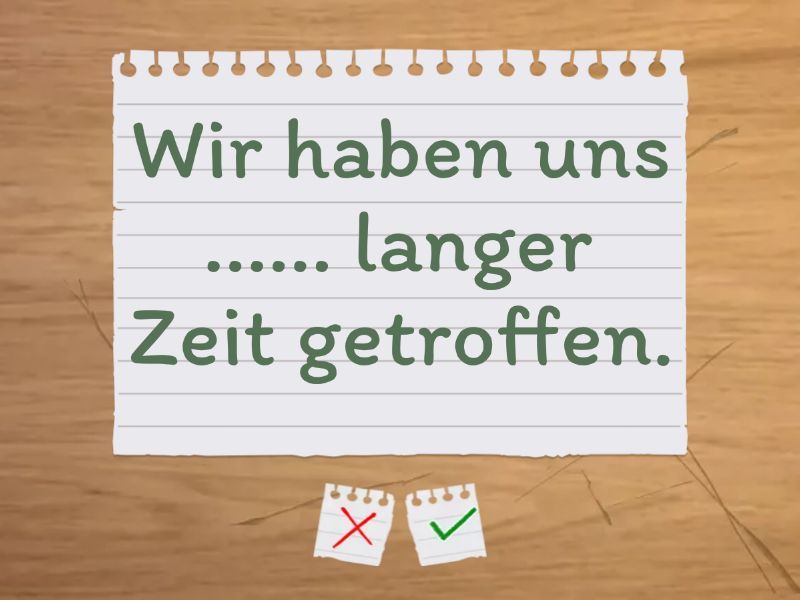 Ich lerne Deutsch ...... einem Jahr. - seit, ....... zwei Monaten arbeite ich in dieser Firma. - seit, Ich habe ihn ...... einer Stunde gesehen. - vor, ...... gestern habe ich Kopfschmerzen. - seit, ..... dem Wochenende kaufe ich ein. - vor, Ich wohne hier ...... 2023. - seit, ...... zwei Tagen war ich beim Arzt. - vor, Ich bin ...... einem Jahr nach Deutschland gekommen. - vor, .... drei Wochen habe ich eine Prüfung gemacht. - vor, Wir haben uns ...... langer Zeit getroffen. - vor, ...... dem Morgen regnet es. - seit, Ich mache Sport ......... letztem Jahr. - seit, Wir sind Freunde ...... der Schule. - seit, ...... der letzten Woche lerne ich viel. - seit, ...... kurzer Zeit habe ich ein neues Handy gekauft. - vor,