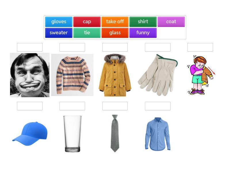 cap, shirt, belt, jeans, socks, tie, pants, shoes, T-shirt, shorts, coat, skirt, glasses, ring, gloves, sweater, funny, high, dress, hat, jacket, take off, thousand, tonight, glass,