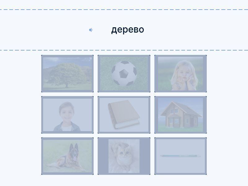 дерево, будинок , дівчинка, хлопчик, м'яч, олівець, книга, котик, собака,