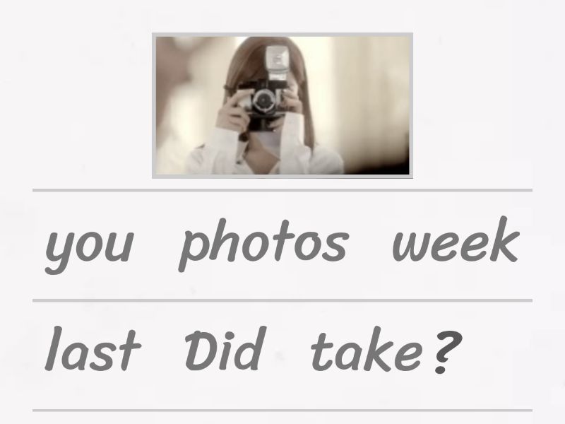 Did you take photos last week?, Did he read a book last weekend?, Did we play videogames yesterday?, Did I buy flowers last Sunday? , Did they go to the cinema last weekend?, Did we see our friends on Wednesday?, Did he watch a film yesterday?, Did she do her homework last evening?, Did your dog find a shell on the beach?, Did they swim in the sea?, Did we jump on the sofa?, Did he catch a fish last morning?,