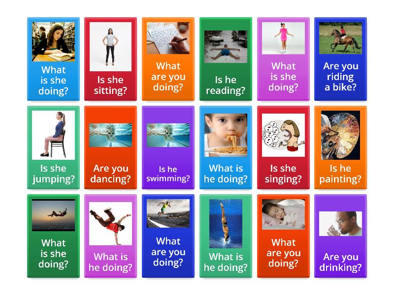 What is she doing? - She's skipping., What is he doing? - He's eating., What is she doing? - She's reading., What is he doing? - He's diving., What is she doing? - She's falling., What is he doing? - He's dancing., What are you doing? - I'm writing., What are you doing? - I'm running., What are you doing? - I'm sleeping., Are you dancing? - No, I'm not., Are you drinking? - Yes, I am., Are you riding a bike? - No, I'm not., Is she singing? - Yes, she is., Is she sitting? - No, she isn't., Is he painting? - Yes, he is., Is she jumping? - No, she isn't., Is he swimming? - Yes, he is., Is he reading? - No, he isn't.,