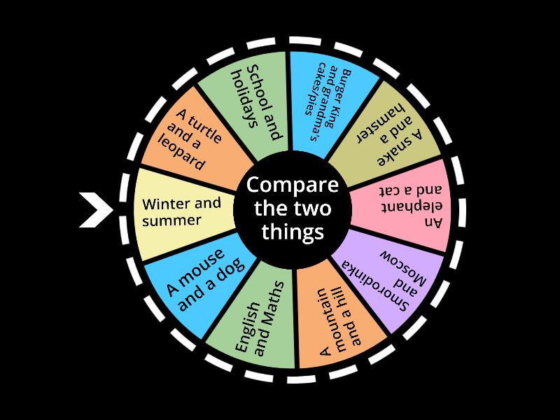 An elephant and a cat, A mountain and a hill, English and Maths, A mouse and a dog, A turtle and a leopard, A snake and a hamster, Smorodinka and Moscow, Burger King and grandma's cakes/pies, Winter and summer, School and holidays.