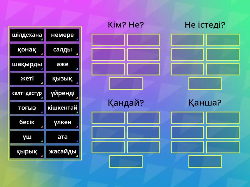 Кім? Не?: ата, салт-дәстүр, шілдехана, бесік, немере, қонақ, әже, Не істеді?: үйренді, салды, жасайды, шақырды, Қандай?: қызық, үлкен, кішкентай, Қанша?: қырық, жеті, үш, тоғыз,