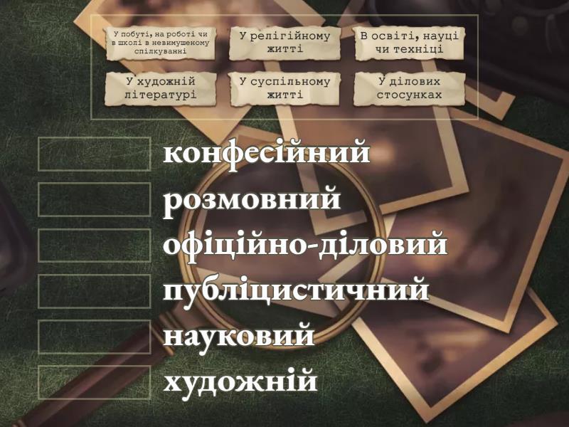 У побуті, на роботі чи в школі в невимушеному спілкуванні - розмовний, В освіті, науці чи техніці - науковий, У художній літературі - художній, У ділових стосунках - офіційно-діловий, У суспільному житті - публіцистичний, У релігійному житті - конфесійний,