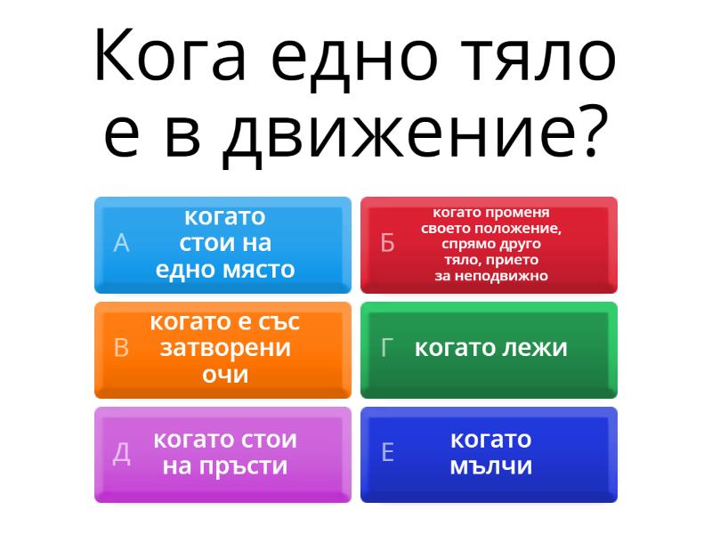 1) Кога едно тяло е в движение? a) когато стои на едно място b) когато променя своето положение, спрямо друго тяло, прието за неподвижно c) когато е със затворени очи d) когато лежи e) когато стои на пръсти f) когато мълчи 2) Кога едно тяло е в покой? a) когато подскача b) когато не говори c) когато танцува d) ако не променя положението си, спрямо друго тяло, прието за неподвижно e) когато се храни f) когато учи урок 3) Какви видове движения извършват телата? a) зигзаго образни b) праволинейни c) спираловидни d) криволинейни e) квадратни f) правоъгълни 4) Кои движения са праволинейни? a) тези, които се движат по права линия b) тези, които подскачат c) тези, които се въртят d) тези, които се търкалят 5) Кои движения са криволинейни? a) тези, които падат b) тези, които се движат по крива линия c) тези, които висят d) тези, които летят 6) Какво движение извършва състезателят на 100 м бягане? a) въртене b) криволинейно c) праволинейно d) зигзагообразно 7) Какви движения са въртенето и движението по окръжност? a) праволинейни b) криволинейни 8) Какво движение извършват стрелките на часовника? a) праволинейно b) криволинейно 9) Излитащата в космоса ракета се движи? a) криволинейно b) праволинейно 10) В движение или в покой се намира пътник в движещ се автомобил спрямо превозното средство? a) в движение b) в покой 11) А спрямо дърветата и сградите, покрай които минава? a) в движение b) в покой