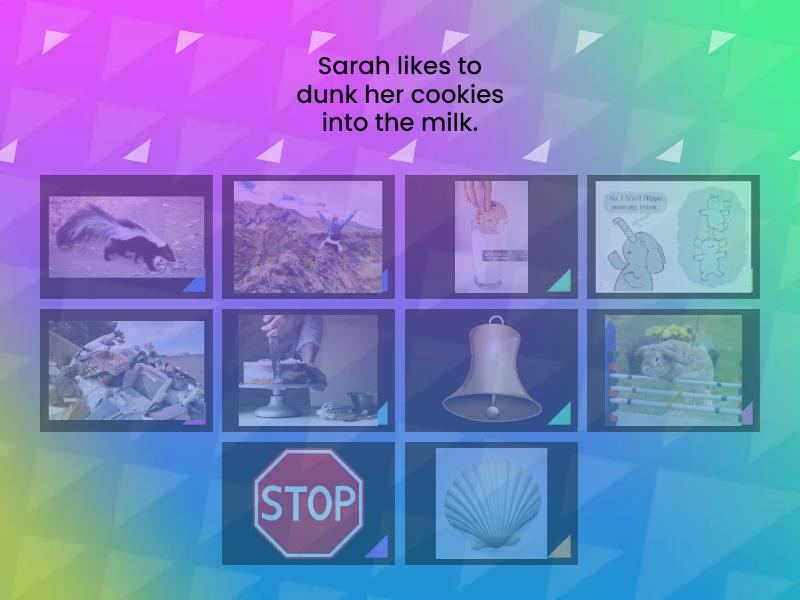 Sarah likes to dunk her cookies into the milk., Look at all this junk!, Oh no! Watch out for that stinky skunk, Lucas!, I broke my trunk!, Matthew wants chocolate frosting on his cake., When you see a stop sign, you need to hit the brake., Priscilla found a white shell on the beach., The bell was so loud when Ari hit it!, Watch the bunny hop over the pole., William climbed a ladder to the top of the mountain.,