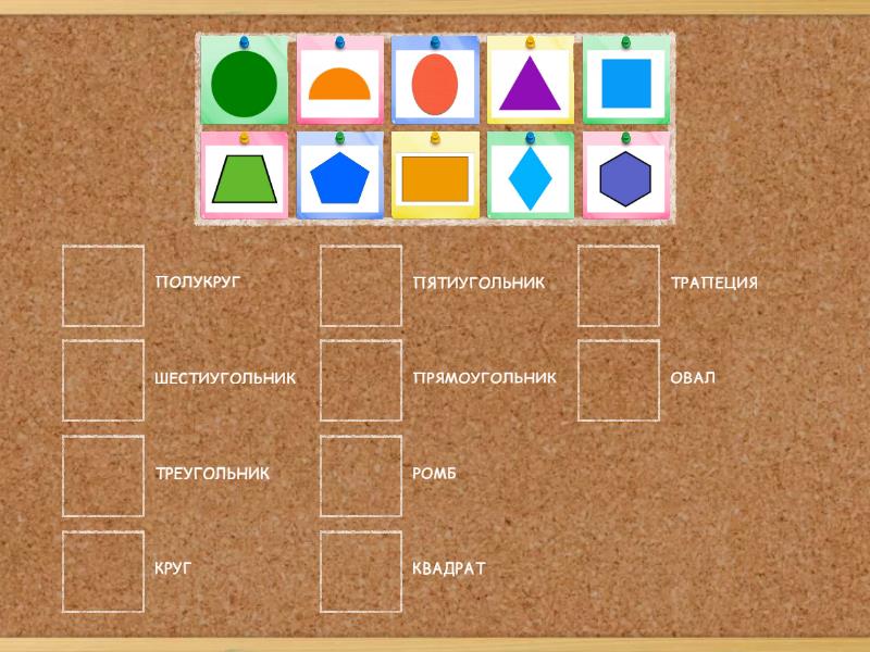 КРУГ, КВАДРАТ, ОВАЛ, ПРЯМОУГОЛЬНИК, ТРЕУГОЛЬНИК, РОМБ, ТРАПЕЦИЯ, ПЯТИУГОЛЬНИК, ПОЛУКРУГ, ШЕСТИУГОЛЬНИК,