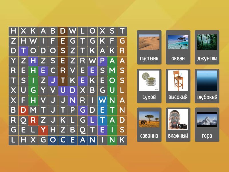 high - высокий, deep - глубокий, dry - сухой, wet - влажный, desert - пустыня, ocean - океан, grasslands - саванна, a mountain - гора, the jungle - джунгли,