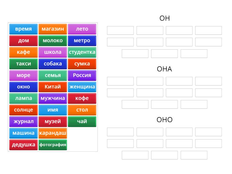 ОН: магазин, журнал, чай, музей, карандаш, Китай, дом, дедушка, мужчина, стол, кофе, ОНА: машина, собака, женщина, лампа, школа, сумка, семья, Россия, фотография, студентка, ОНО: метро, окно, кафе, молоко, море, лето, солнце, имя, время, такси,