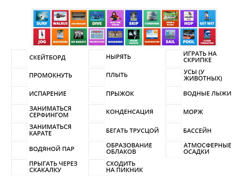 CLOUD FORMATION - ОБРАЗОВАНИЕ ОБЛАКОВ, CONDENSE - КОНДЕНСАЦИЯ, DIVE - НЫРЯТЬ, DO KARATE - ЗАНИМАТЬСЯ КАРАТЕ, EVAPORATION - ИСПАРЕНИЕ, GET WET - ПРОМОКНУТЬ, HAVE A PICNIC - СХОДИТЬ НА ПИКНИК, HOP - ПРЫЖОК, JOG - БЕГАТЬ ТРУСЦОЙ, PLAY THE VIOLIN - ИГРАТЬ НА СКРИПКЕ, POOL - БАССЕЙН, PRECIPITATION - АТМОСФЕРНЫЕ ОСАДКИ, SAIL - ПЛЫТЬ, SKATEBOARD - СКЕЙТБОРД, SKIP - ПРЫГАТЬ ЧЕРЕЗ СКАКАЛКУ, SURF - ЗАНИМАТЬСЯ СЕРФИНГОМ, WALRUS - МОРЖ, WATER VAPOUR - ВОДЯНОЙ ПАР, WATERSKI - ВОДНЫЕ ЛЫЖИ, WHISKERS - УСЫ (У ЖИВОТНЫХ),