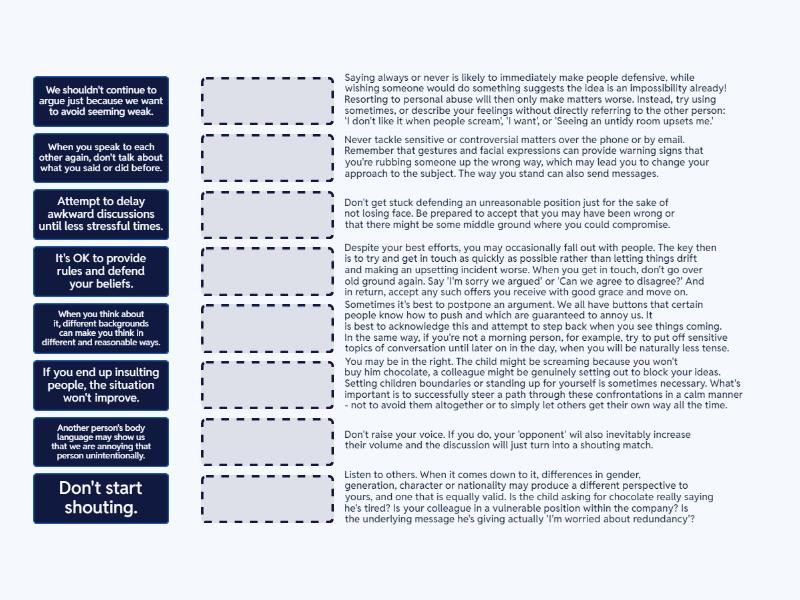 It's OK to provide rules and defend your beliefs. - You may be in the right. The child might be screaming because you won't buy him chocolate, a colleague might be genuinely setting out to block your ideas. Setting children boundaries or standing up for yourself is sometimes necessary. What's important is to successfully steer a path through these confrontations in a calm manner - not to avoid them altogether or to simply let others get their own way all the time., Don't start shouting. - Don't raise your voice. If you do, your 'opponent' wil also inevitably increase their volume and the discussion will just turn into a shouting match., If you end up insulting people, the situation won't improve. - Saying always or never is likely to immediately make people defensive, while wishing someone would do something suggests the idea is an impossibility already! Resorting to personal abuse will then only make matters worse. Instead, try using sometimes, or describe your feelings without directly referring to the other person: 'I don't like it when people scream', 'I want', or 'Seeing an untidy room upsets me.', Attempt to delay awkward discussions until less stressful times. - Sometimes it's best to postpone an argument. We all have buttons that certain people know how to push and which are guaranteed to annoy us. It is best to acknowiedge this and attempt to step back when you see things coming. In the same way, if you're not a morning person, for example, try to put off sensitive topics of conversation until later on in the day, when you will be naturally less tense., When you think about it, different backgrounds can make you think in different and reasonable ways. - Listen to others. When it comes down to it, differences in gender, generation, character or nationality may produce a different perspective to yours, and one that is equally valid. Is the child asking for chocolate really saying he's tired? Is your colleague in a vulnerable position within the company? Is the underlying message he's giving actually 'I'm worried about redundancy'?, We shouldn't continue to argue just because we want to avoid seeming weak. - Don't get stuck defending an unreasonable position just for the sake of not losing face. Be prepared to accept that you may have been wrong or that there might be some middle ground where you could compromise., Another person's body language may show us that we are annoying that person unintentionally. - Never tackle sensitive or controversial matters over the phone or by email. Remember that gestures and facial expressions can provide warning signs that you're rubbing someone up the wrong way, which may lead you to change your approach to the subject. The way you stand can also send messages., When you speak to each other again, don't talk about what you said or did before. - Despite your best efforts, you may occasionally fall out with people. The key then is to try and get in touch as quickly as possible rather than letting things drift and making an upsetting incident worse. When you get in touch, don't go over old ground again. Say 'I'm sorry we argued' or 'Can we agree to disagree?' And in return, accept any such offers you receive with good grace and move on.,