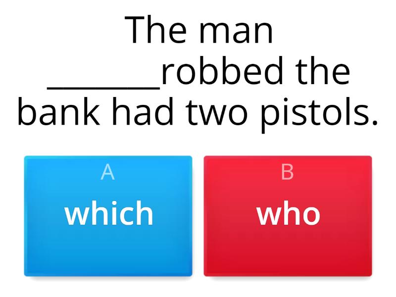 1) The man _______robbed the bank had two pistols. a) which b) who 2) He wore a mask ________made him look like Mickey Mouse. a) which b) where 3) He came with a friend _________waited outside in the car. a) that b) where 4) The woman ________gave him the money was young. a) which b) who 5) The bag _________contained the money was yellow. a) that b) where 6) The people ________ were in the bank were very scared. a) which b) who 7) The car ________ he escaped in was orange. a) that b) who 8) The man _________ drove the car was nervous. a) which b) that 9) He didn't wait at the traffic lights ________ were red. a) which b) where 10) This is the bank _________ was robbed. a) who b) that 11) The policeman ________ helped heople was happy. a) who b) which 12) In the town ______ was the crime is dark enough. a) who b) where