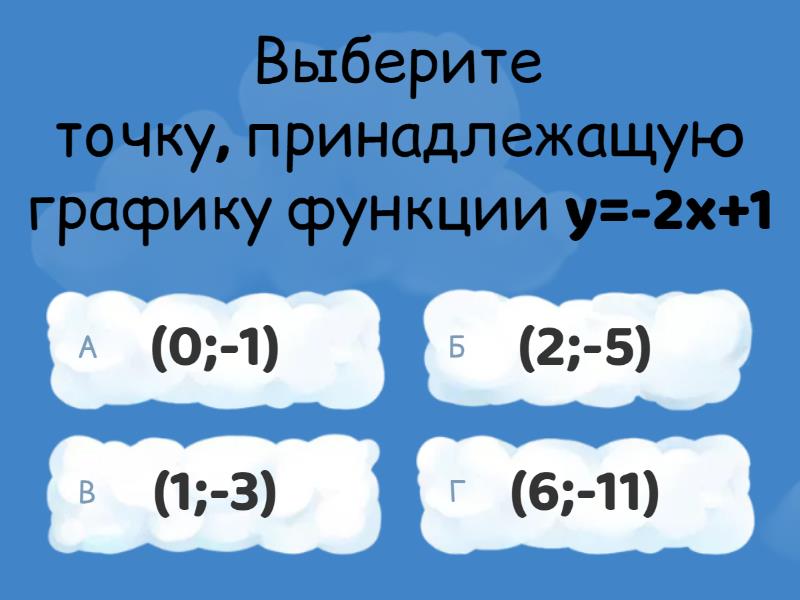 1) Выберите точку, принадлежащую графику функции y=x-2 a) (0;-2) b) (-2;0) c) (1;1) d) (0;0) 2) Выберите точку, принадлежащую графику функции y=x+6 a) (-6;-12) b) (-1;5) c) (-3;-9) d) (0;0) 3) Выберите точку, принадлежащую графику функции y=-2x+1 a) (0;-1) b) (2;-5) c) (1;-3) d) (6;-11) 4) Выберите точку, принадлежащую графику функции y=-0,5x-3 a) (0;3) b) (4;-1) c) (-2;-2) d) (-8;-7) 5) Выберите точку, принадлежащую графику функции y=8x a) (-1;8) b) (0;0) c) (2;-16) d) (0,5;0,4)