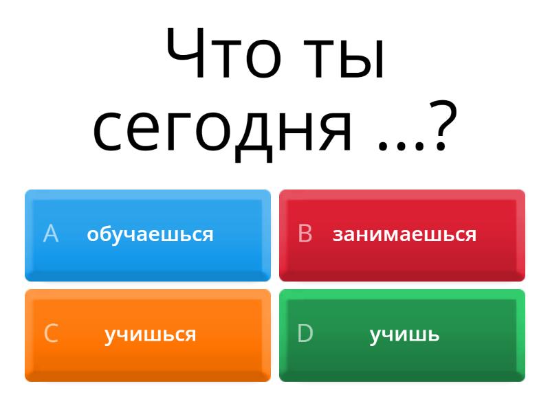 1) Что ты сегодня ...? a) обучаешься b) занимаешься c) учишься d) учишь 2) В школах Страны Басков, помимо эускеры, дети .... 2 иностранных языка. a) обучаются b) изучают c) учатся d) занимаются 3) Для того, чтобы говорить грамотно по-испански, нужно ... все формы неправильных глаголов. a) изучать b) изучить c) выучить d) научить 4) Обычно отцы учат своих детей водить машину. Педро ... свою дочь парковаться. a) выучил b) изучил c) научил d) учился 5) В молодости я работала в государственной школе, где я ... английский язык. a) преподавала b) научила c) учила d) изучила 6) Моя дочь ... читать в 5 лет. С тех пор она прочитала много книг. a) училась b) выучилась c) обучалась d) научилась 7) Если человек хорошо ..., ему легче получить высшее образование. a) изучает b) учится c) научится d) учит 8) Ты учишь детей ...? a) математике b) математику c) математикой d) математика 9) Интересно, чем он сейчас ...? a) обучается b) учится c) учит d) занимается