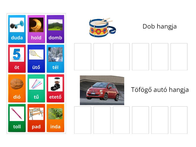 Dob hangja: domb, dió, duda, hold, pad, inda, Töfögő autó hangja: toll, tél, ütő, öt, tű, etető,