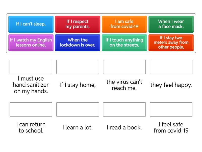If I can't sleep, - I read a book., When I wear a face mask, - I feel safe from covid-19, I am safe from covid-19 - If I stay home,, If I touch anything on the streets, - I must use hand sanitizer on my hands., If I stay two meters away from other people, - the virus can't reach me., When the lockdown is over, - I can return to school., If I watch my English lessons online, - I learn a lot., If I respect my parents, - they feel happy.,