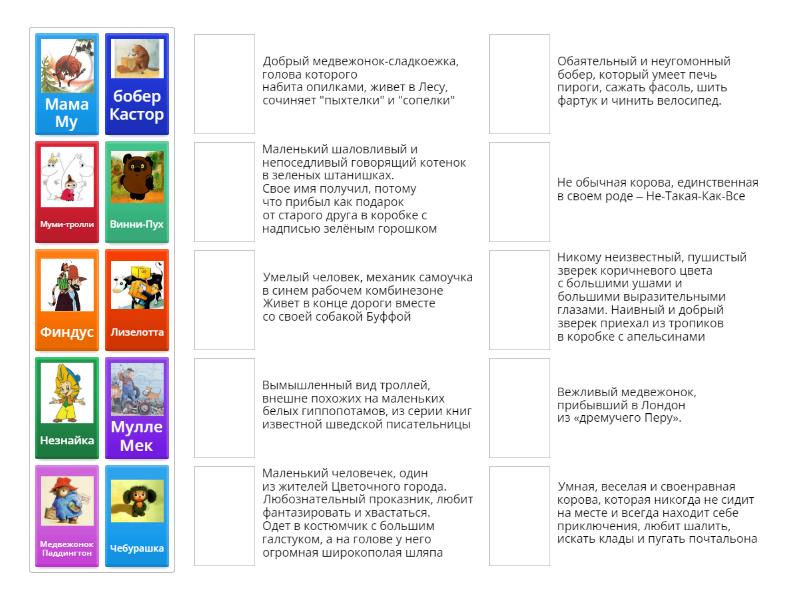 Финдус - Маленький шаловливый и непоседливый говорящий котенок в зеленых штанишках. Свое имя получил, потому что прибыл как подарок от старого друга в коробке с надписью зелёным горошком, Чебурашка - Никому неизвестный, пушистый зверек коричневого цвета с большими ушами и большими выразительными глазами. Наивный и добрый зверек приехал из тропиков в коробке с апельсинами, Муми-тролли - Вымышленный вид троллей, внешне похожих на маленьких белых гиппопотамов, из серии книг известной шведской писательницы, Медвежонок Паддингтон - Вежливый медвежонок, прибывший в Лондон из «дремучего Перу»., Винни-Пух - Добрый медвежонок-сладкоежка, голова которого набита опилками, живет в Лесу, сочиняет "пыхтелки" и "сопелки", Незнайка - Маленький человечек, один из жителей Цветочного города. Любознательный проказник, любит фантазировать и хвастаться. Одет в костюмчик с большим галстуком, а на голове у него огромная широкополая шляпа, Мулле Мек - Умелый человек, механик самоучка в синем рабочем комбинезоне Живет в конце дороги вместе со своей собакой Буффой, бобер Кастор - Обаятельный и неугомонный бобер, который умеет печь пироги, сажать фасоль, шить фартук и чинить велосипед., Лизелотта - Умная, веселая и своенравная корова, которая никогда не сидит на месте и всегда находит себе приключения, любит шалить, искать клады и пугать почтальона, Мама Му - Не обычная корова, единственная в своем роде – Не-Такая-Как-Все,