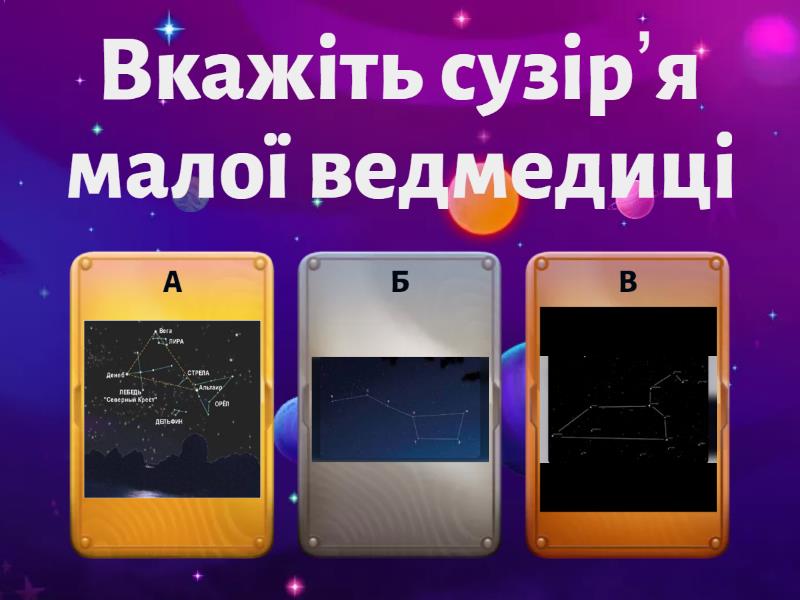 1) Вкажіть сузір’я малої ведмедиці a) b) c) 2) Формула Дрейка a) b) c) 3) Планета Марс a) b) c) 4) Планета Земля a) b) c) 5) Планета Нептун a) b) c)