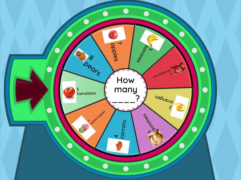 1) 7 apples 2) 3 bananas 3) 4 carrots 4) 2 oranges 5) 5 tomatoes 6) 8 pears 7) 6 potatoes 8) 9 strawberries 9) 1 watermelon