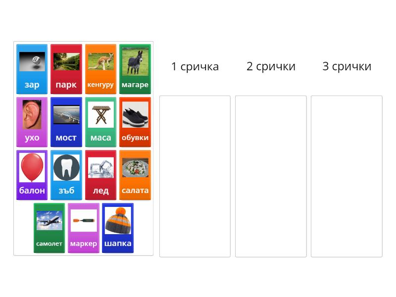 1 сричка: лед, зъб, зар, парк, мост, 2 срички: маса, балон, маркер, шапка, ухо, 3 срички: салата, самолет, кенгуру, обувки, магаре,