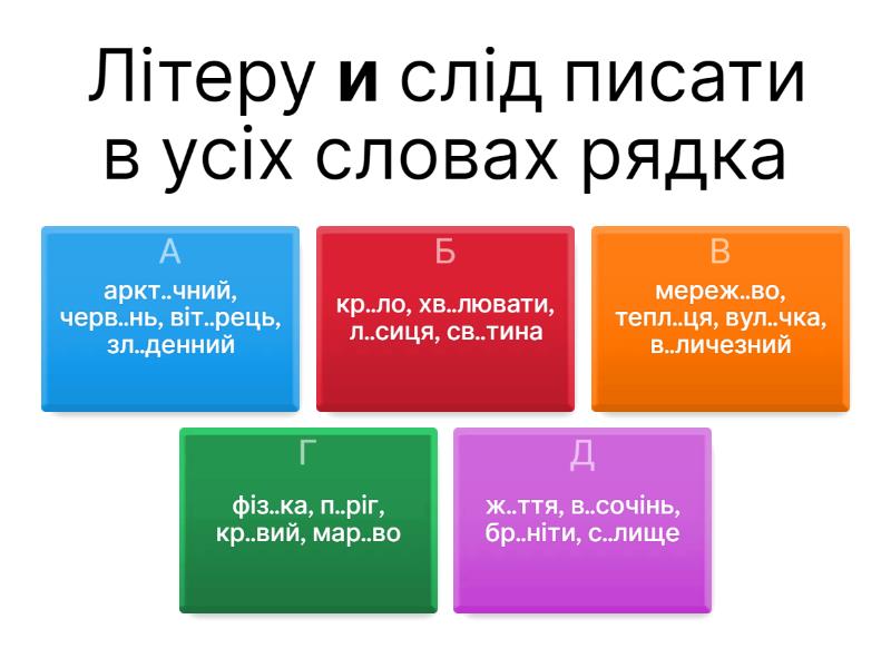 1) Літеру и слід писати в усіх словах рядка a) аркт..чний, черв..нь, віт..рець, зл..денний b) кр..ло, хв..лювати, л..сиця, св..тина c) мереж..во, тепл..ця, вул..чка, в..личезний d) фіз..ка, п..ріг, кр..вий, мар..во e) ж..ття, в..сочінь, бр..ніти, с..лище 2) Літеру е слід писати в усіх словах рядка a) вип..щений, долон..чка, м..тричний, зуп..нятися b) удалеч..ні, ліж..чко, м..ткий, кр..латий c) книж..чка, м..даль, ш..почеться, шел..ст d) од..колон, б..нтежити, дал..на, кл..котіти e) піс..нька, б..рег, кач..чка, боч..чка, зуп..нка 3) Усі слова вживаються без апострофа у рядку a) дзв..якнути, мавп..ячий, цв..ях, медв..яний, моркв..яний b) рум..яний, мереф..янський, верб..я, В..ячеслав, Лук..яненко c) роз..ятрити, з..ясувати, міль..ярд, гар..ячий, фортеп..яно d) трьох..ярусний, дит..ясла, р..юмсати, Св..ятослав, пред..явник e) Мін..юст, св..ято, р..ясно, б..юст, бур..ян 4) Усі слова вживаються з апострофом у рядку a) моркв..яний, любов..ю, ком..юніке, різьб..ярство b) Лук..янівка, розв..язати, Стеф..юк, з..юрмитися c) пор..ядок, св..яткувати, торф..яник, духм..яний d) грав..юра, надвечір..я, В..язьма, пред..явник e) трав..яний, черв..як, св..ященник, прем..єра 5) М'який знак слід писати в усіх словах рядка, ОКРІМ a) міл..ярд, брин..чати, модел..єр b) учител..чин, калинон..ці, Бат..ківщина c) Ман..чжурія, (у) жмен..ці, промін..чик d) Тан..чин, жен..шень, піднос..ся e) пал..чик, дон..чин, нян..чити 6) НЕ потрібна жодна буква на місці пропуску в усіх словах рядка a) безвиїз..но, облас..ний, пес..ливий b) балас..ний, шіс..надцятий, перс..ні c) ад’ютан..ський, свис..нути, улес..ливий d) захис..ний, кіс..лявий, турис..ський e) наміс..ник, тиж..ня, ціліс..ний 7) Подвоєні букви треба писати в усіх словах рядка a) від..звеніти, щоден..ик, завдан..ь b) попідтин..ю, склян..ий, об..ризкати c) гостин..ість, бов..аніти, л..яний d) числен..ий, шален..ий, незмін..ий 8) Зі знаком м'якшення всі слова пишуться в рядку a) нян..чити, брен..кати, вел..можа, т..мяний b) віс..тю, нен..чин, змен..шити , (у) бан..ці c) приятел..ці, таріл..ці, різ..бяр, учител.ство d) Натал..ці, людс..кість, камін..чик, туш.. e) кін..чик, спанієл.., ал..янс, ад..ю 9) Треба вставити букву на місці пропуску в усіх словах рядка a) фашис..ський, гус..нути, скатер..ка, швидкіс..ний b) студен..ство, піз..ній, безсовіс..ний, зліс..ний c) форпос..ний, контрас..ний, хвас..ливий, d) аген..ство, хорис..ці, блис..нути, зап'яс..ний e) пропагандис..ський, навмис..не, бряз..нути, фашис..ський 10) Подовження приголосних відбувається в усіх словах рядка a) креслен..я, стат..я, парост..ю, безсмерт..я b) тверджен..я, буйноквіт..я, сторіч.., піддаш..я c) безчест..я, клун..я, відкрит..ів, повноліт..я d) бездоріж..я, варен..я, засил..я, прохан..я