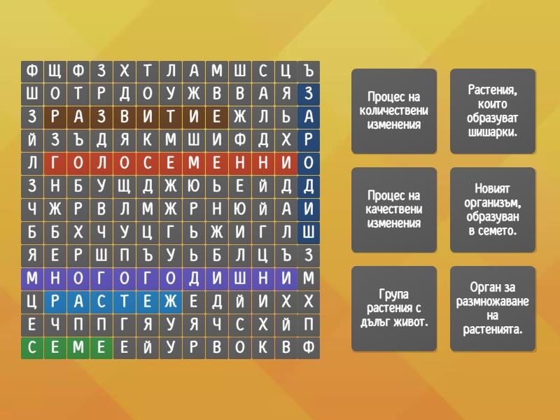 семе - Орган за размножаване на растенията., многогодишни - Група растения с дълъг живот., голосеменни - Растения, които образуват шишарки., растеж - Процес на количествени изменения, развитие - Процес на качествени изменения, зародиш - Новият организъм, образуван в семето.,