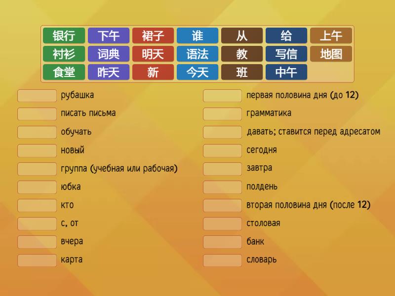 从 - с, от, 给 - давать; ставится перед адресатом, 写信 - писать письма, 班 - группа (учебная или рабочая), 今天 - сегодня, 昨天 - вчера, 明天 - завтра, 上午 - первая половина дня (до 12), 下午 - вторая половина дня (после 12), 中午 - полдень, 教 - обучать, 谁 - кто, 语法 - грамматика, 食堂 - столовая, 词典 - словарь, 银行 - банк, 地图 - карта, 新 - новый, 裙子 - юбка, 衬衫 - рубашка,