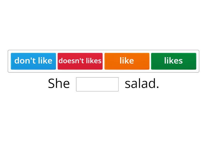 She ____ salad. It doesn't ____ sandwiches. She likes ____ chicken. Do you like fruit? Yes, I ____. I like fruit. Does she have tape? No, she doesn't. She ____ paper.