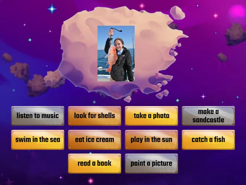 catch a fish, paint a picture, eat ice cream, take a photo, listen to music, look for shells, read a book, make a sandcastle, play in the sun, swim in the sea,
